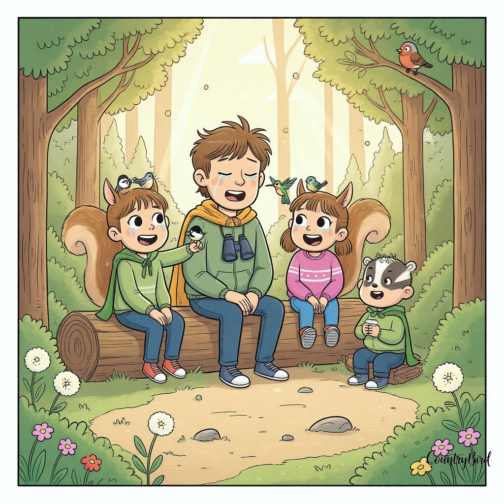 A mother and child sitting quietly on a log in a forest, listening with tilted heads as a bird sings nearby.